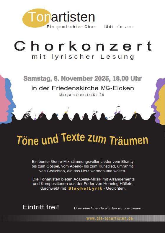 | Weitere Infos | Ich lese auf dem Konzert meines Chores "Die Tonartisten" und umrahme das musikalische Programm mit Gedichten und Texten. |
