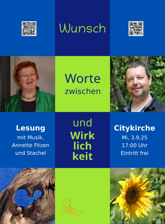 | Weitere Infos | Nach mehreren sehr erfolgreichen gemeinsamen Lesungen wird es mal wieder Zeit, dass Annette und ich unsere neuen Texte zum Besten geben, aufgelockert durch meine Musik am Klavier. |