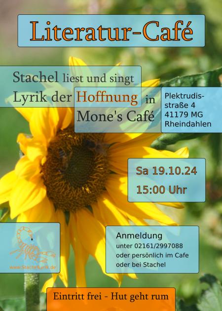 | Weitere Infos | Stachel liest und singt Lyrik der Hoffnung Link zur Location: www.mones-cafe-herzlich.de Eintritt frei, Anmeldung erforderlich unter 02161-2997088 |